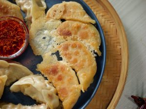 -Serve dumplings with Schezwan garlic chilli oil & dumping dipping sauce.