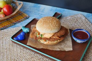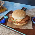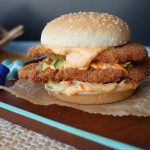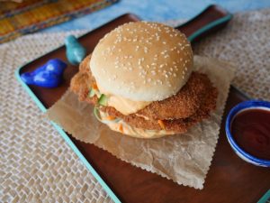 On burger bun add and spread prepared sriracha mayo sauce, pickled vegetables, Katsu fried chicken, sriracha mayo sauce, pickled vegetables, katsu fried chicken, sriracha mayo sauce and cover with burger bun.