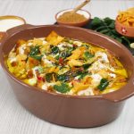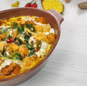-Serving dish mein phulkiyan,tayyar dahi mixture,tayyar khattay aloo,dahi mixture,green chutney,tayyar tarka aur papri dal ker serve karein!