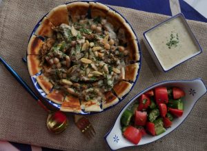 In serving bowl,add chickpeas,pita bread,cooked & shredded chicken,fried almonds and drizzle prepared yogurt sauce and garnish with fresh parsley & serve!