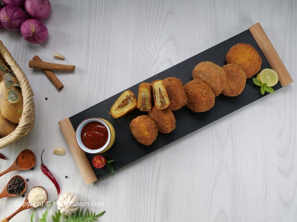 -Aloo ko peel ker ka ½ inch thick slices mein cut ker lein phir half-moon mein cut karein (it will make it open up like a book) & qeema filling bhar dein & side per rakh dein.