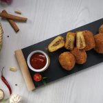 -Dip stuffed potato in whisked eggs & coat with breadcrumbs then again dip in whisked eggs & coat with breadcrumbs.