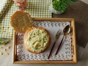 In bread bowl,add mac n cheese pasta,mozzarella cheese,parmesan cheese powder,fresh parsley and cover with top.
