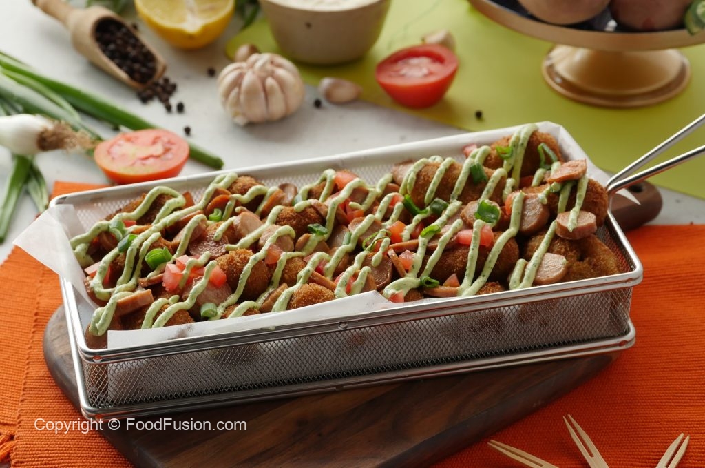 Arrange fried poppers in a dish, add fried sausages, tomatoes, prepared sauce, spring onion & serve!