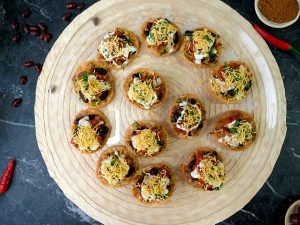 On papri,add lobia chaat,prepared tangy tamatar chutney,yogurt,sprinkle chaat masala,red chilli crushed,fresh coriander,sev,lemon juice & serve!