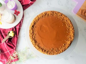 Drizzle melted lotus spread on the edges & sprinkle crushed biscuits.