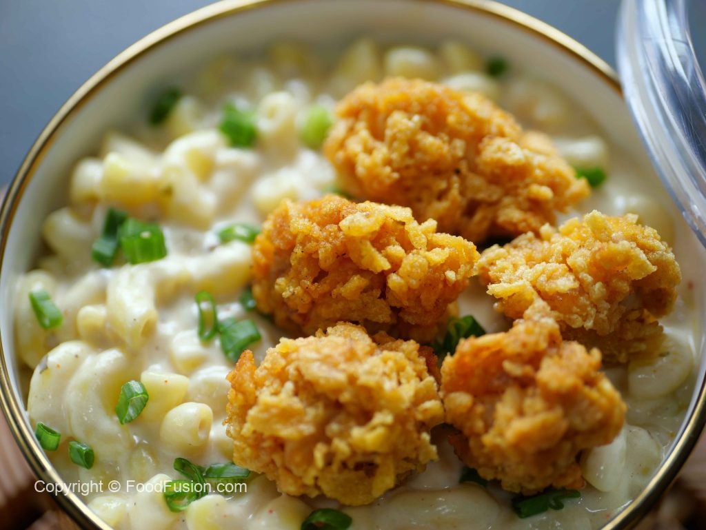 Mac & Cheese with Popcorn Chicken — a lunchbox favorite and comfort food classic! Creamy, cheesy pasta paired with crispy chicken bites makes every bite a treat. Perfect for school, work, or a cozy meal at home! #happycookingtoyou #foodfusion #araywahh #lunchboxideas