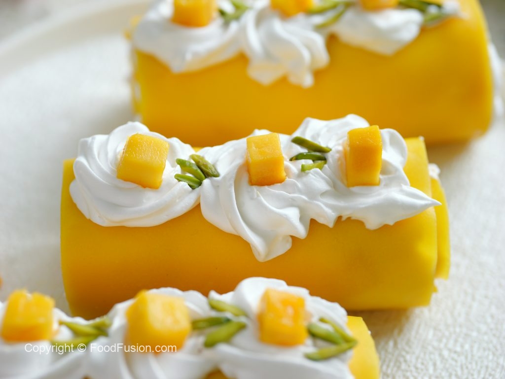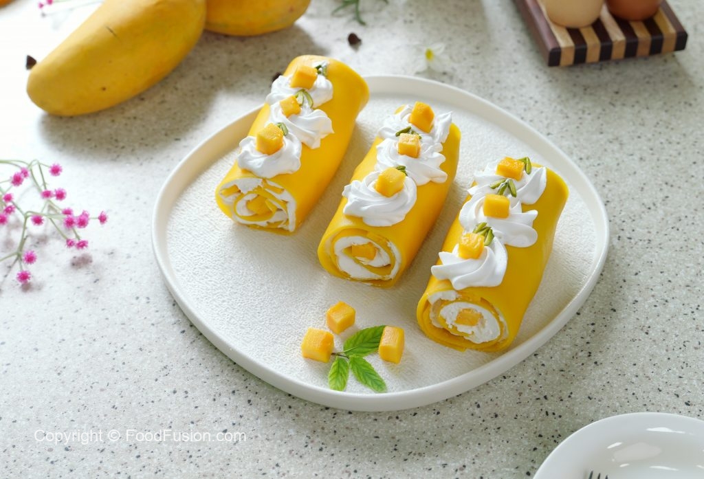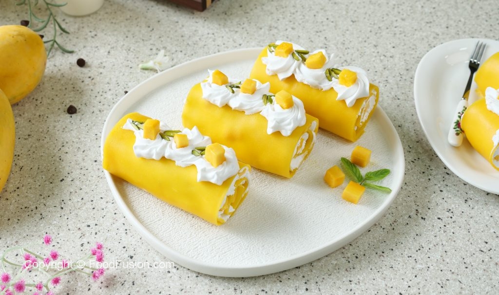 Soft crepes filled with cream and mango chunks – every bite melts in your mouth and makes you say, aray wahh! #happycookingtoyou #foodfusion #araywahh #mango