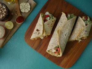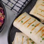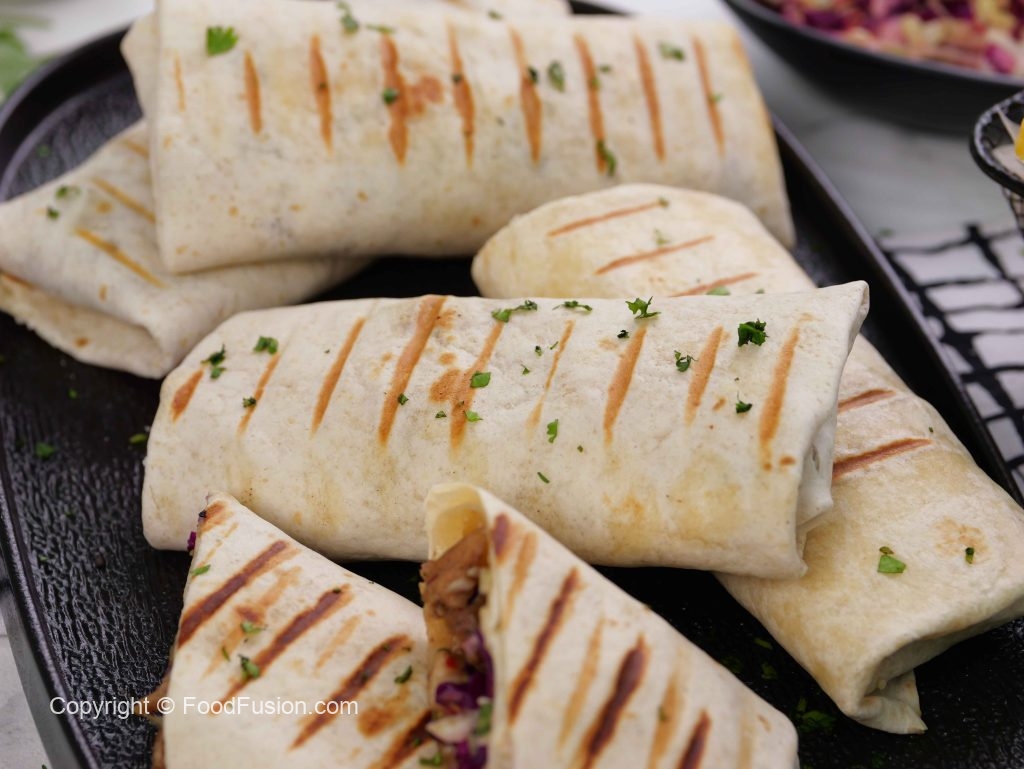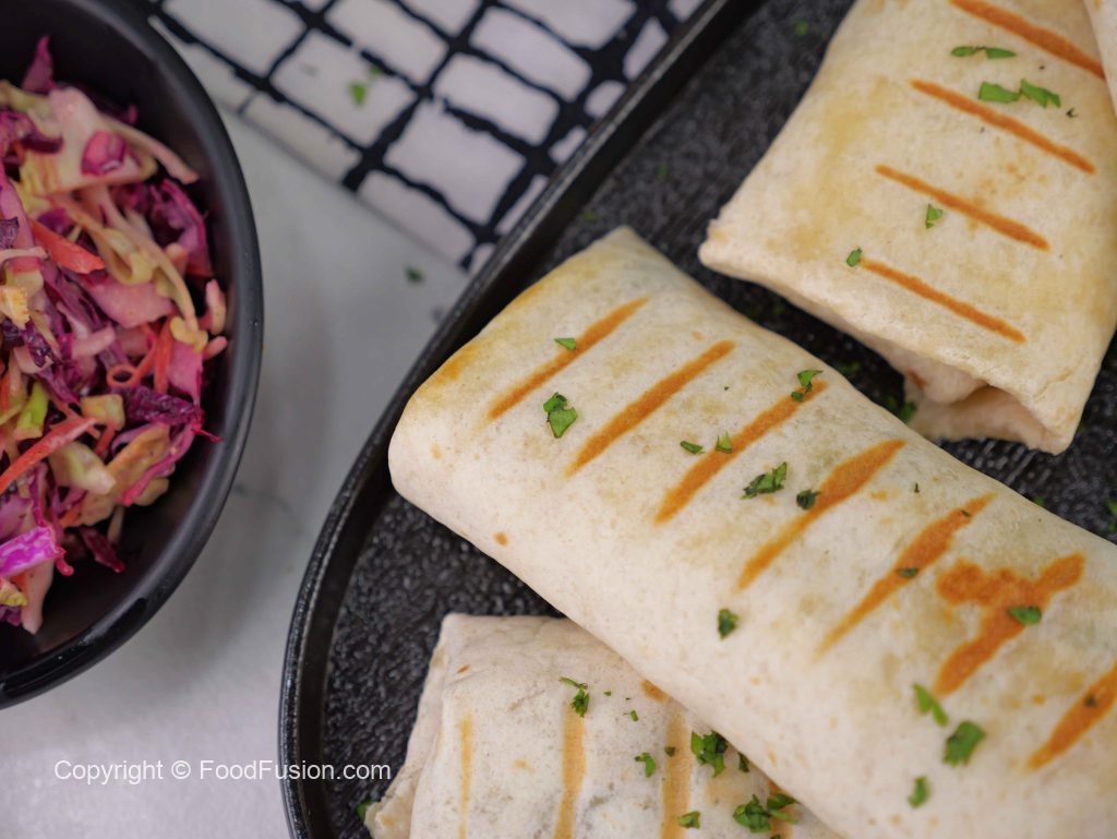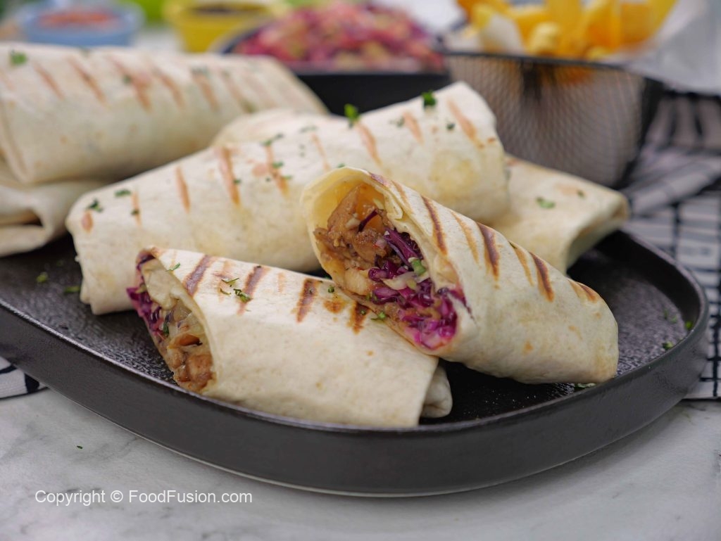 -On a tortilla, add cooked chicken, coleslaw, teriyaki glaze, grilled pineapple, sesame seeds, spring onion leaves, fold & roll up.