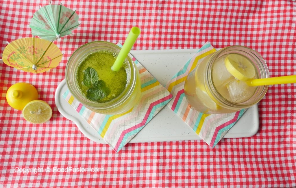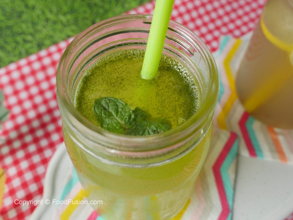 Blender jar mein ice cubes,podina,kala namak,tayyar lemon squash aur soda water dal ker ache tarhan blend ker lein phir strain ker ka serve karein!