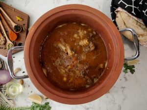 In mutton trotters,add salt,black cardamom,cloves,black peppercorns,cinnamon sticks,bay leaf,ginger garlic paste,hot water and mix well,bring it to boil,cover and cook on low flame until tender (2-3 hours) 3 cups of water should be left.