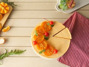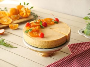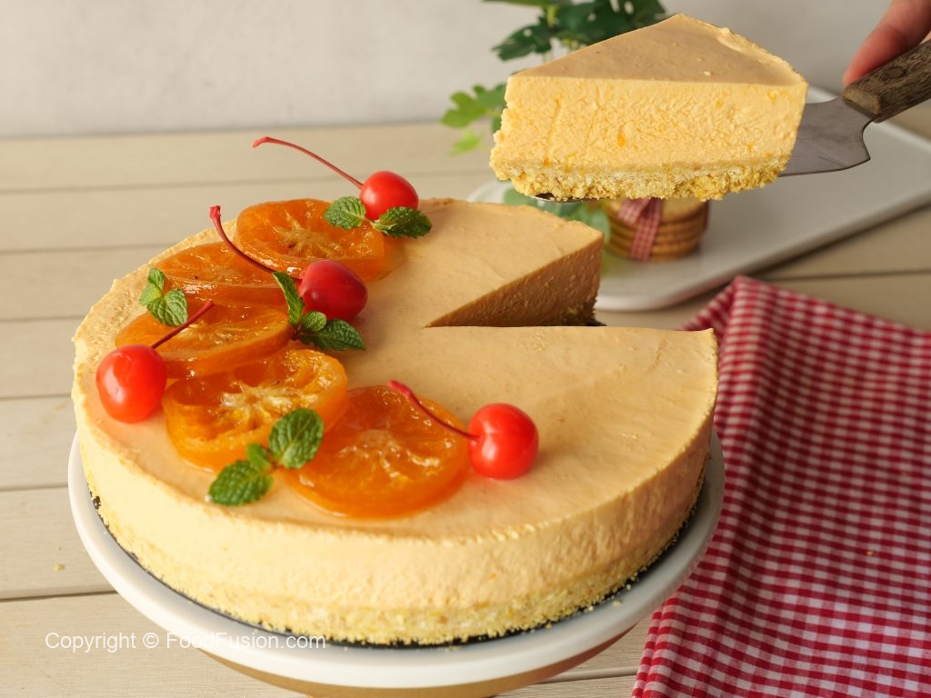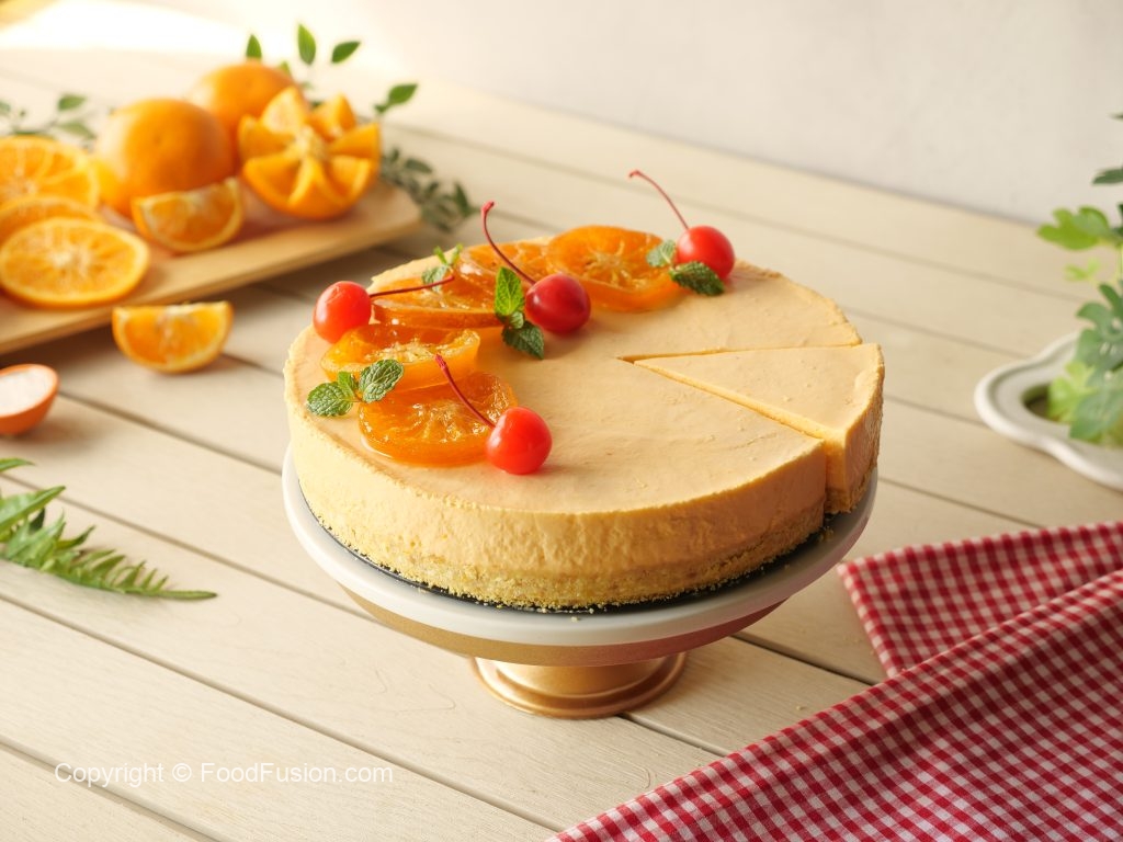 -Cheese cake ko carefully springform pan se nikal lein,candied orange slices,cherries aur podina sa garnish ker ke serve karein!