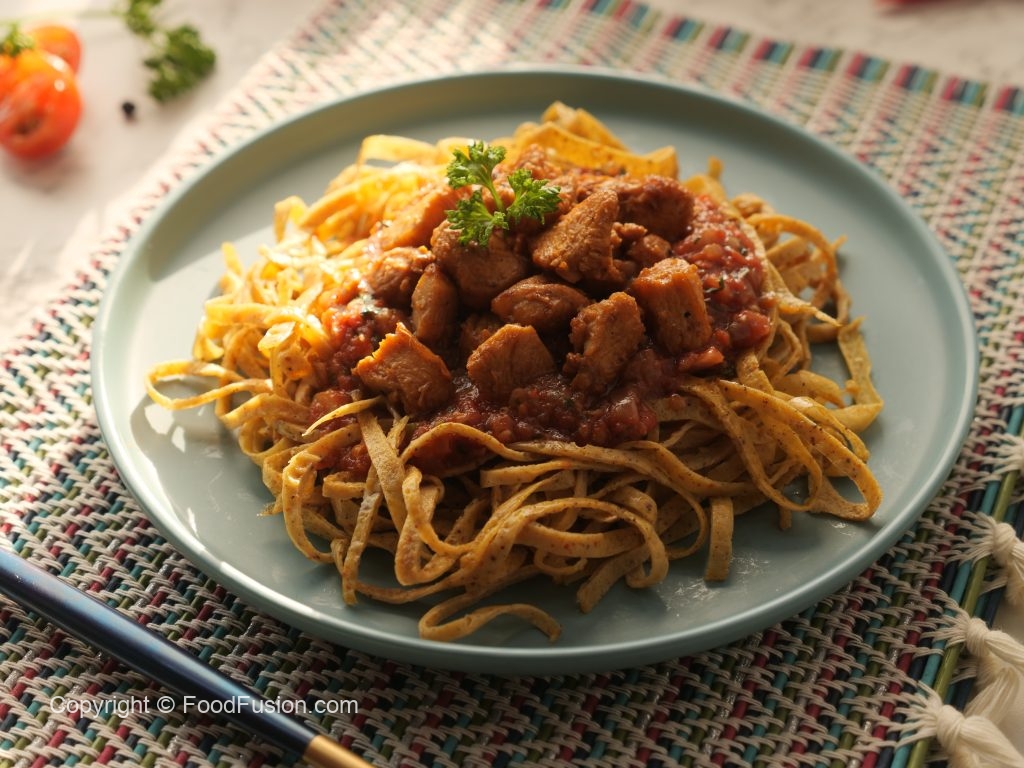 -Serving plate mein tayyar egg noodles,marinara sauce aur cooked chicken dal ker serve karein!