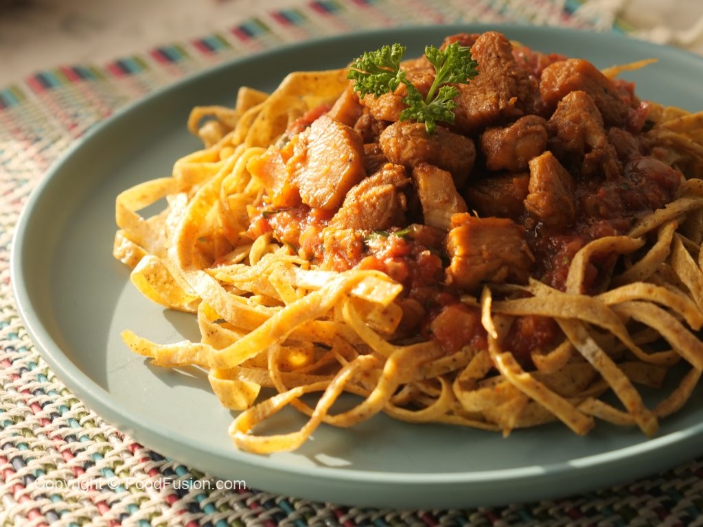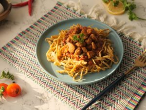 -On a serving plate,add prepared egg noodles,marinara sauce,cooked chicken & serve!