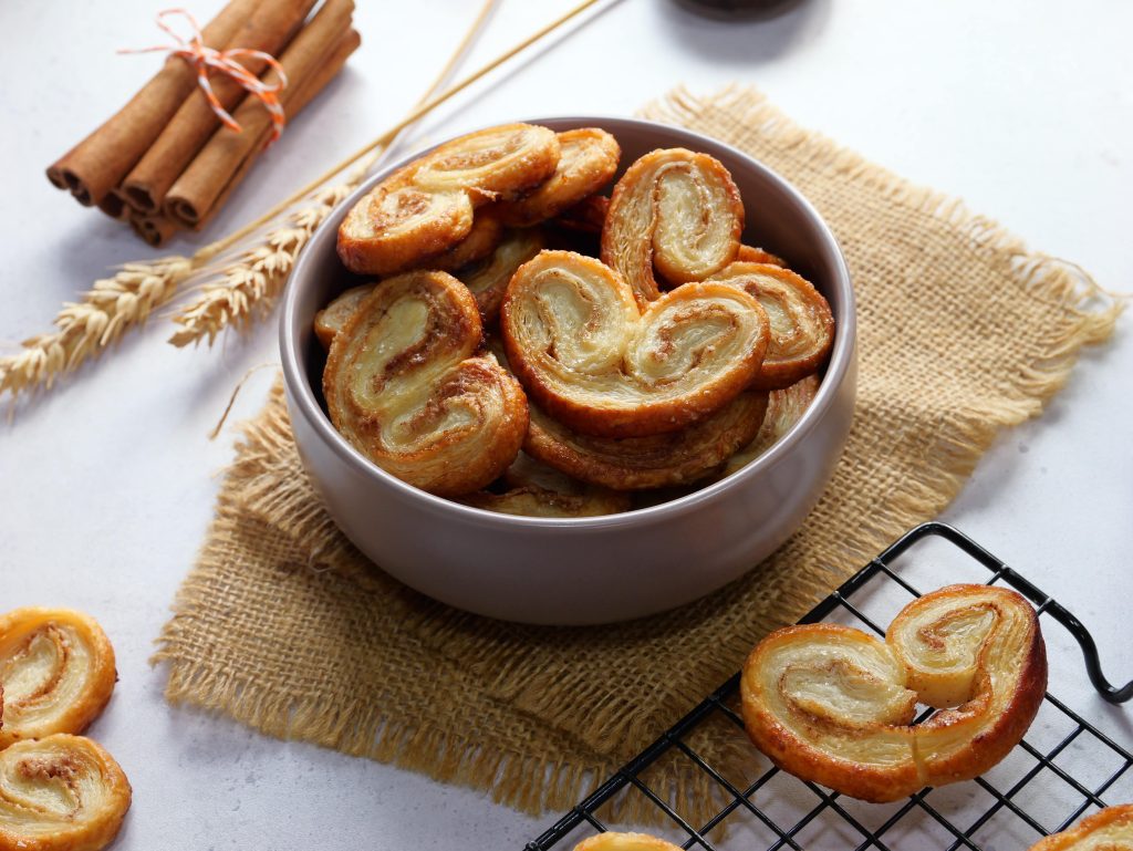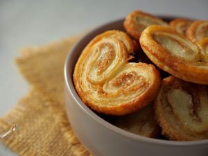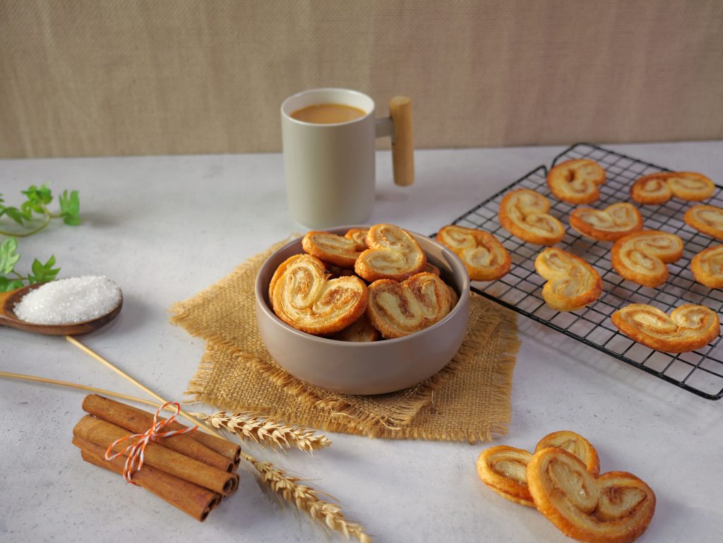 -Sprinkle cinnamon & sugar mixture,fold 1 & ½ inch rolled puff-pastry from left & right for 3 times and refrigerate for 10 minutes then cut into ½ inch slices & make heart shape & place in a baking tray (greased & lined with baking paper),brush egg white & sprinkle caster sugar.