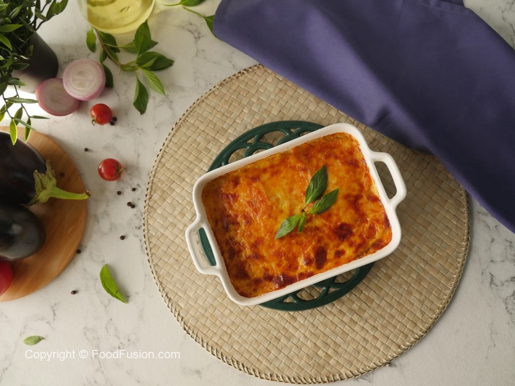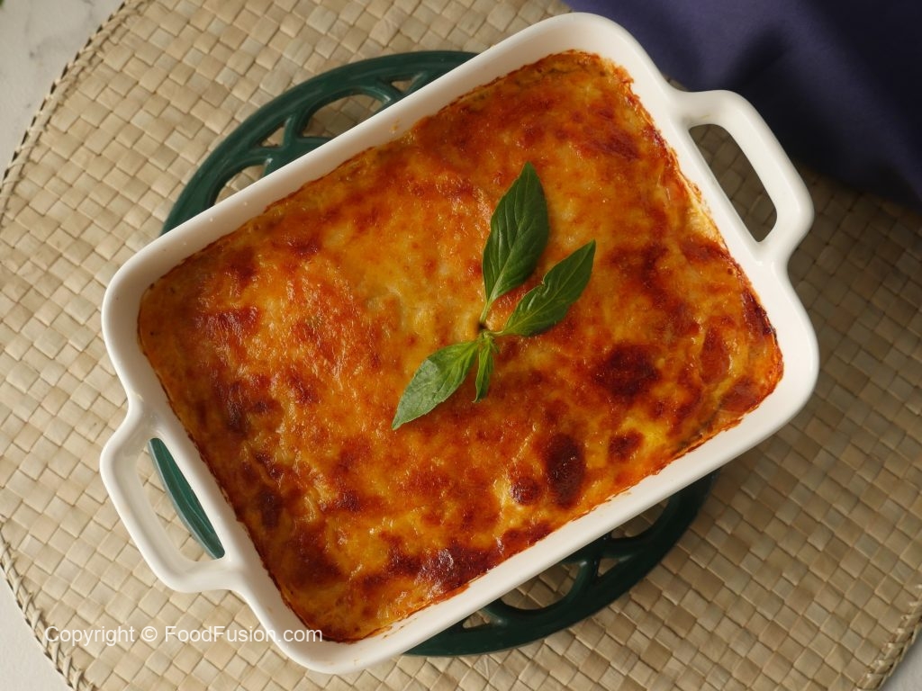 Baking dish mein tayyar tomato sauce,fried baingan slices,tayyar tomato sauce,mozzarella cheese, parmesan cheese,fresh basil leaves,fried baingan slices,prepared tomato sauce,mozzarella cheese aur parmesan cheese dal dein.