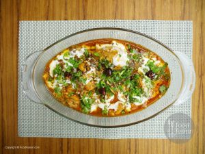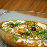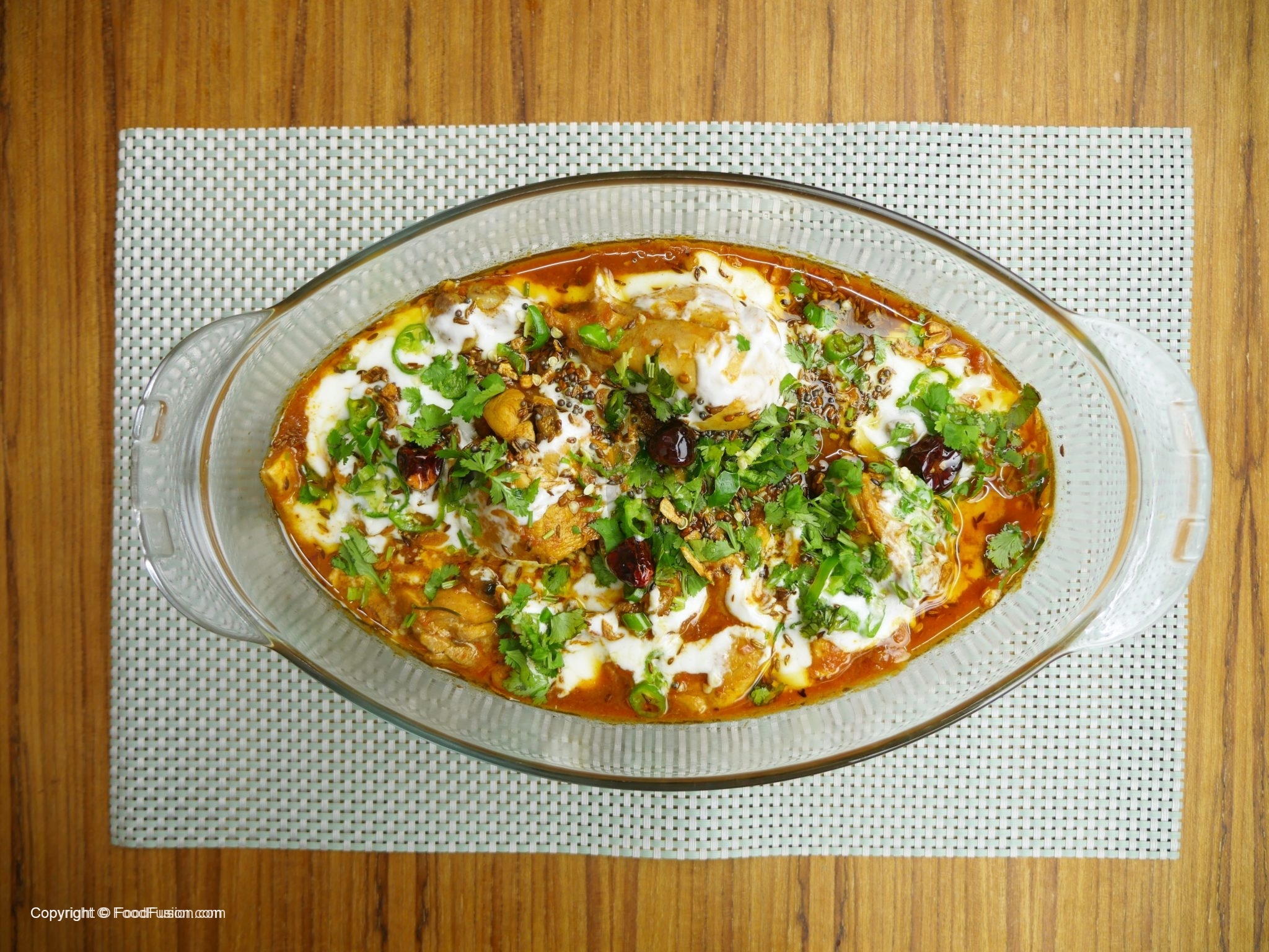 In frying pan,add oil,garlic,cumin seeds,button red chilies,mustard seeds,fenugreek seeds,mix well and pour tadka on peshawari chicken.