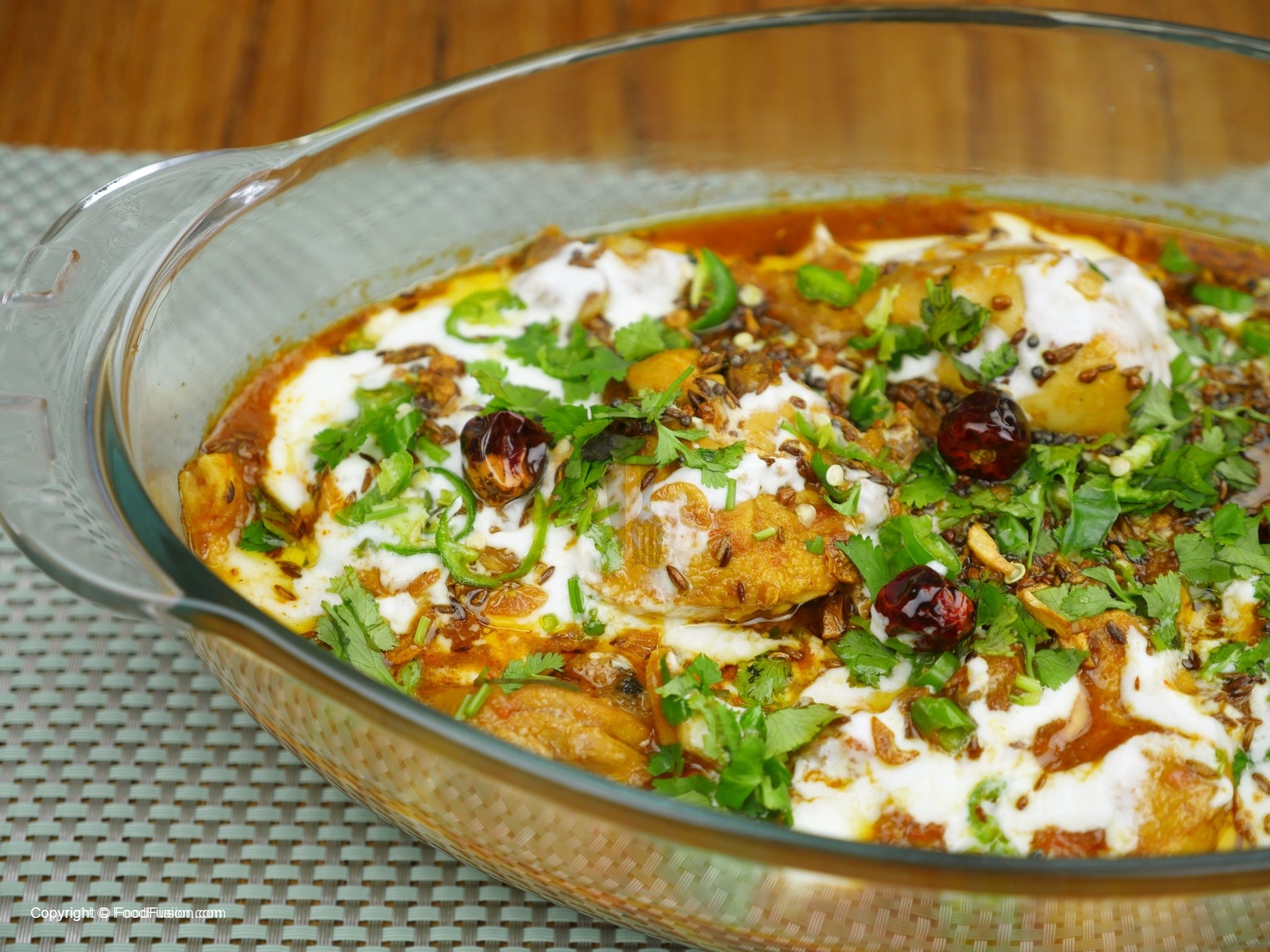 Frying pan mein oil,lehsan,zeera,lal mirch,rai dana,methi dana dal ker mix ker lein,ab tadka ko peshwari murgh per dal dein.