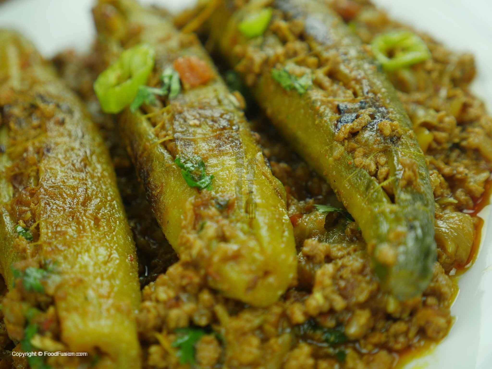 Pan mein oil garam ker k qeema bharay karele 7-8 mins kliya sunhairi honay tak fry kerlein.