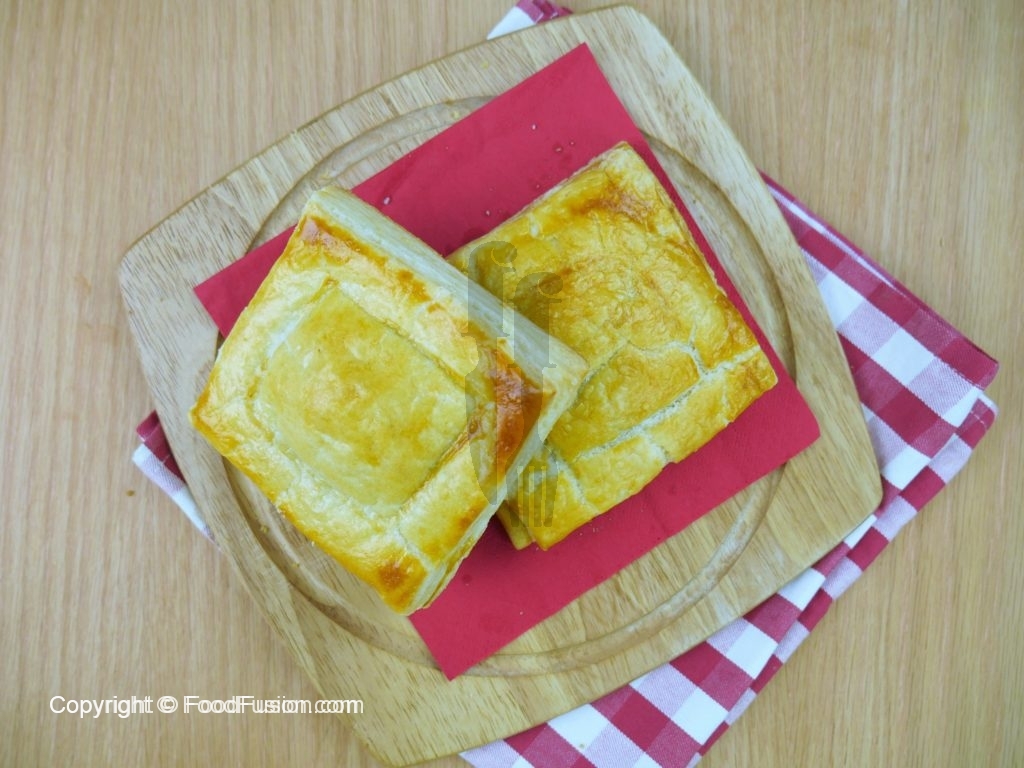 Roll out puff pastry,cut in desired shape with cutter,egg wash,add mince filling,put another piece on top and gently press to seal and egg wash again.