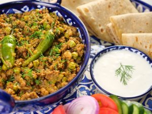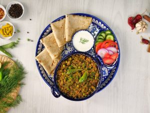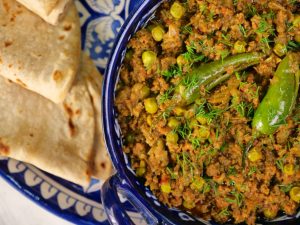 -In a serving dish add soya qeema matar, garnish with dill. Serve with chapati, yogurt, & salad.