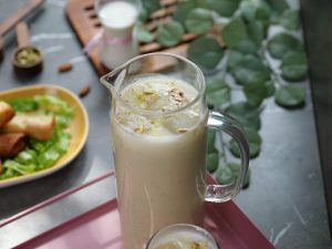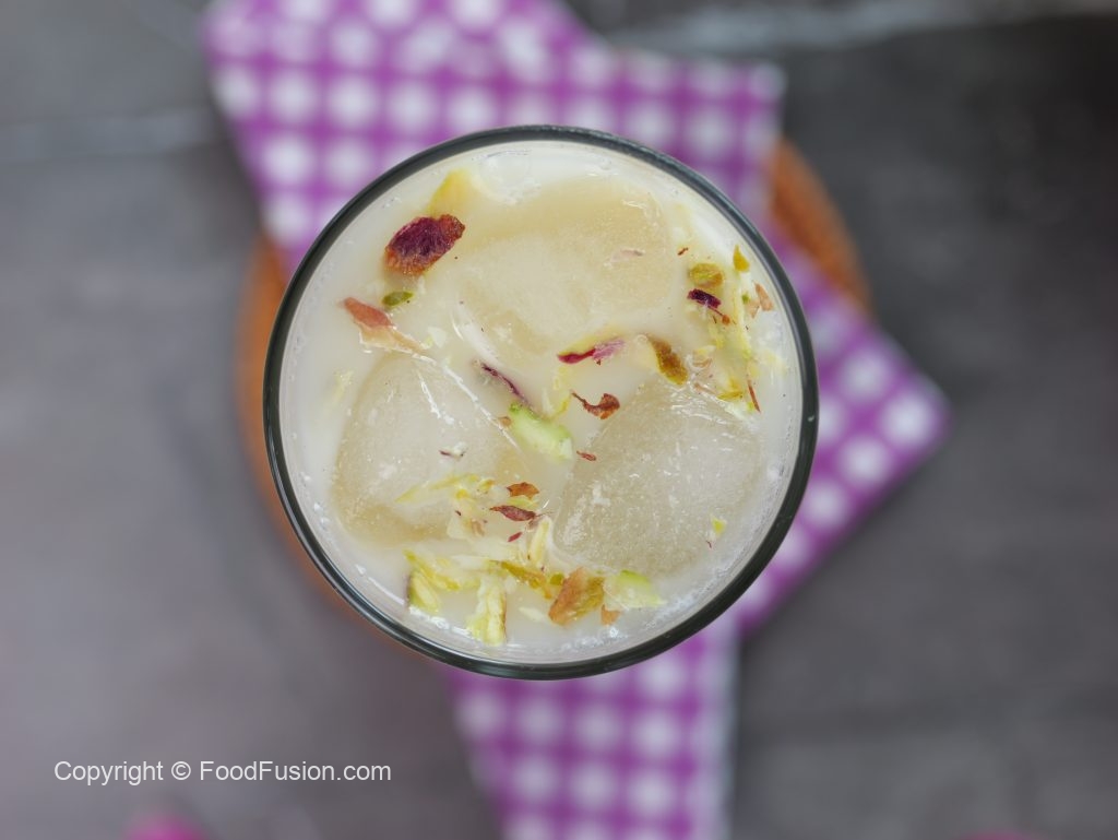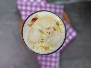 -In a glass,add ice cubes,pour rabri milk & garnish with pistachio & almond.