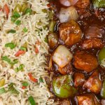 -Serve spicy Schezwan chicken gravy with fried rice!