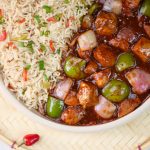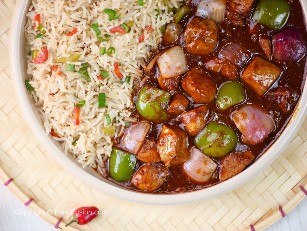 -Spicy Schezwan chicken gravy ko fried rice ka saath serve karein.