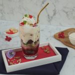 -In a serving glass,add soaked basil seeds,lal sharbat,prepared falooda sawaiyan,mixed nuts,green jelly,red jelly,apple,banana,grapes,pineapple,prepared rabri,vanilla ice-cream,garnish with mixed nuts,,tutti frutti & serve!