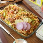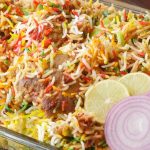 Spread dissolved red food color,green food color,orange food color & yellow food color,mint leaves, fresh coriander,fried onion,cover & steam cook on low flame for 18-20 minutes.