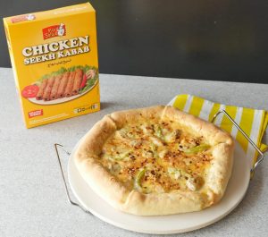 Mozzarella cheese,cooked chicken,mushrooms,pyaz,lal mirch crushed,cheddar cheese,shimla mirch aur mozzarella cheese dal ker lal mirch crushed sprinkle ker lein (makes 2 large pizza).