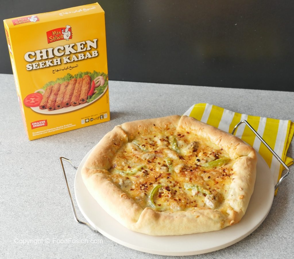 Greased baking pan mein rolled dough rakh dein aur mozzarella cheese dal ker dough ka edges per stuffed seekh kabab rakh dein aur dough ko ander ki taraf fold ker lein.