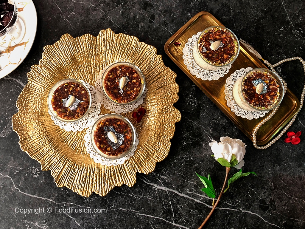 Serving glass mein tayyar sheer khurma dal ker upper sa date mousse disc rakh dein.