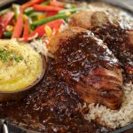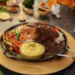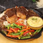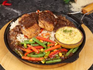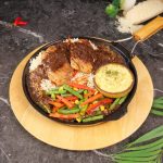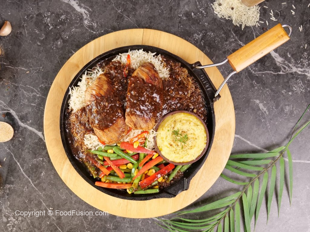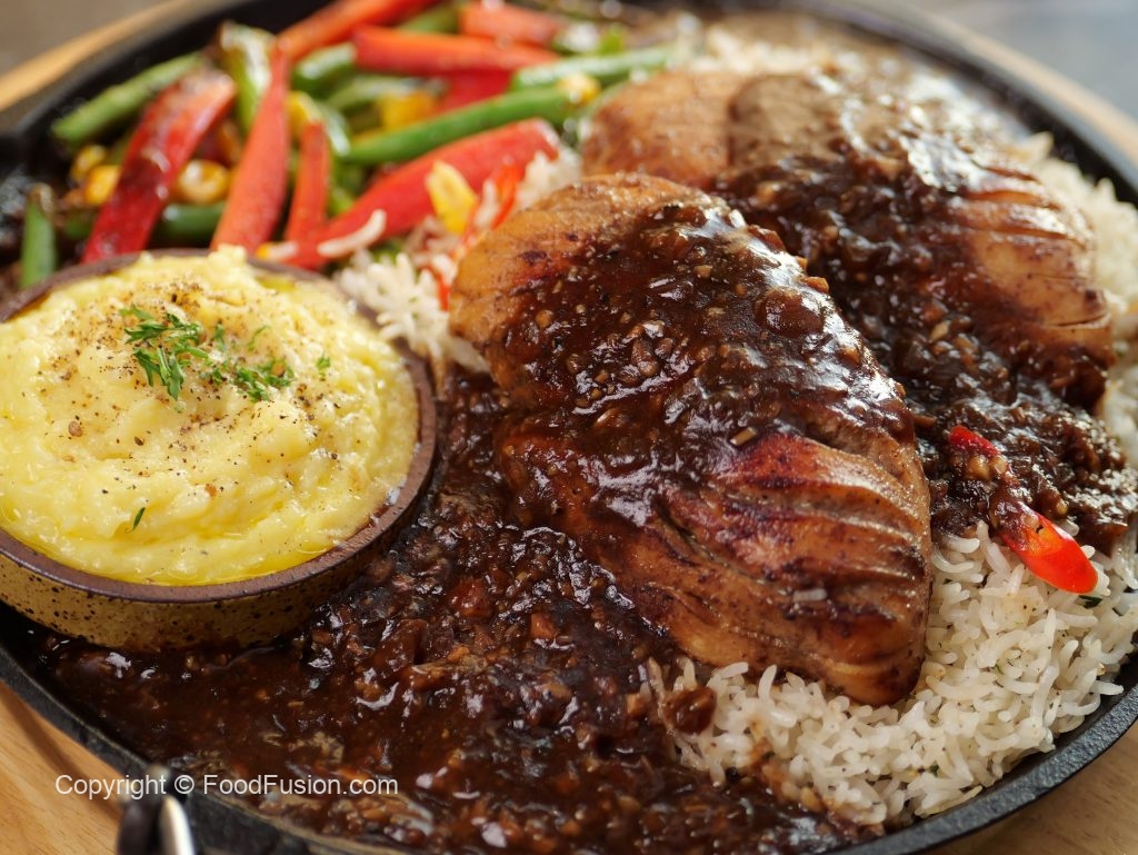 -Add garlic fried rice,stir fried vegetables,creamy mashed potato,chicken fillets,garlic & pepper sauce & serve!