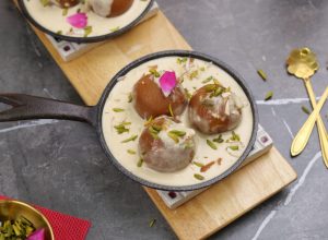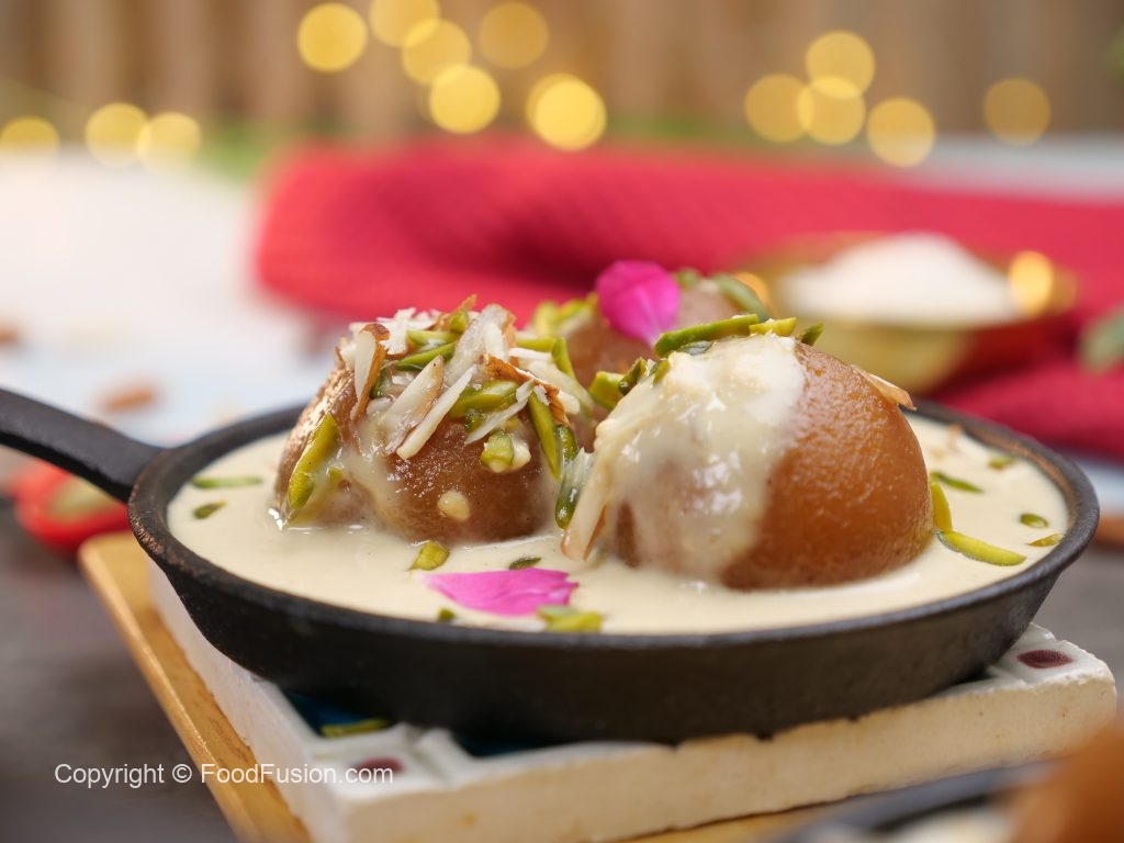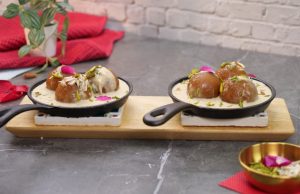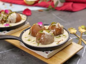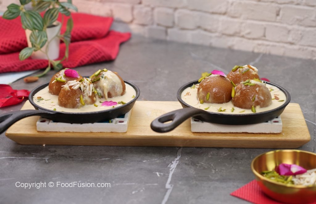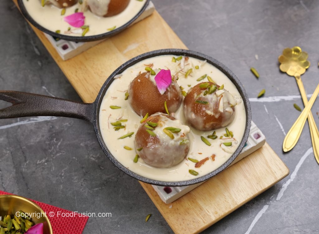 -Heated small cast iron pan mein gulab jamun,tayyar garam rabri,pista aur badam dal dein aur rose petal sa garnish ker ka serve karein!