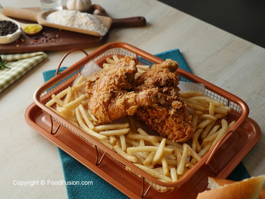 Karhai mein cooking oil (155 C) per garam karein aur chicken pieces ko halki ancch per golden & crispy hunay tak fry ker lein (10-12 minutes).
