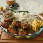 Fried fish ko zeera chawal,potato fries/chips,pyaz rings,imli podina chutney ka saath serve karein.