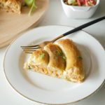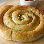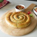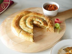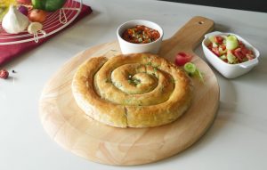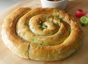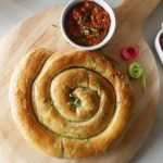 Grease baking tray with melted butter,make a spiral shape of rolled paratha & join both rolled parathas together,pinch and seal the end tightly and fold underneath and apply melted butter with the help of the brush.