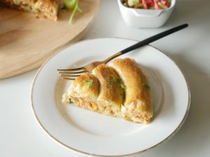 Add & spread prepared chicken filling,fold paratha with dusted flour hands and seal by applying water.