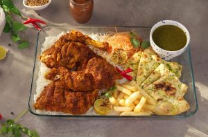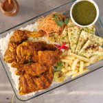 -Serve steam chicken with rice,garlic naan,french fries & tamarind green sauce!