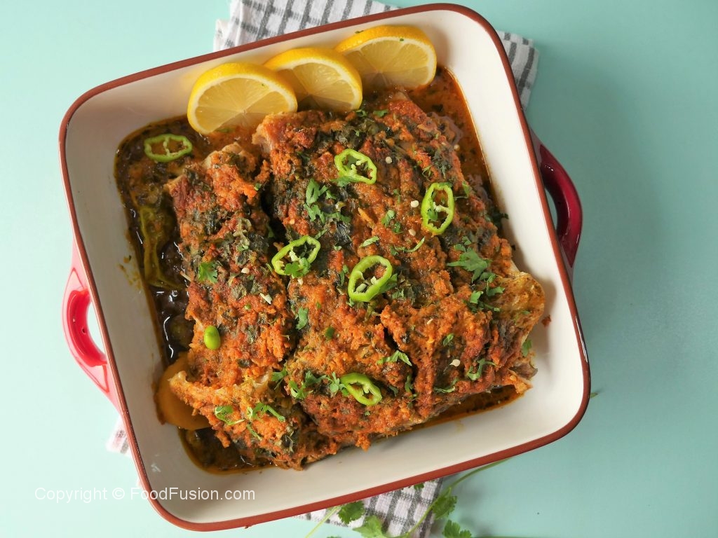 Kasuri meethi dal dein aur steam rack rakh ker marinated machli rakh dein aur hara dhania dal dein.