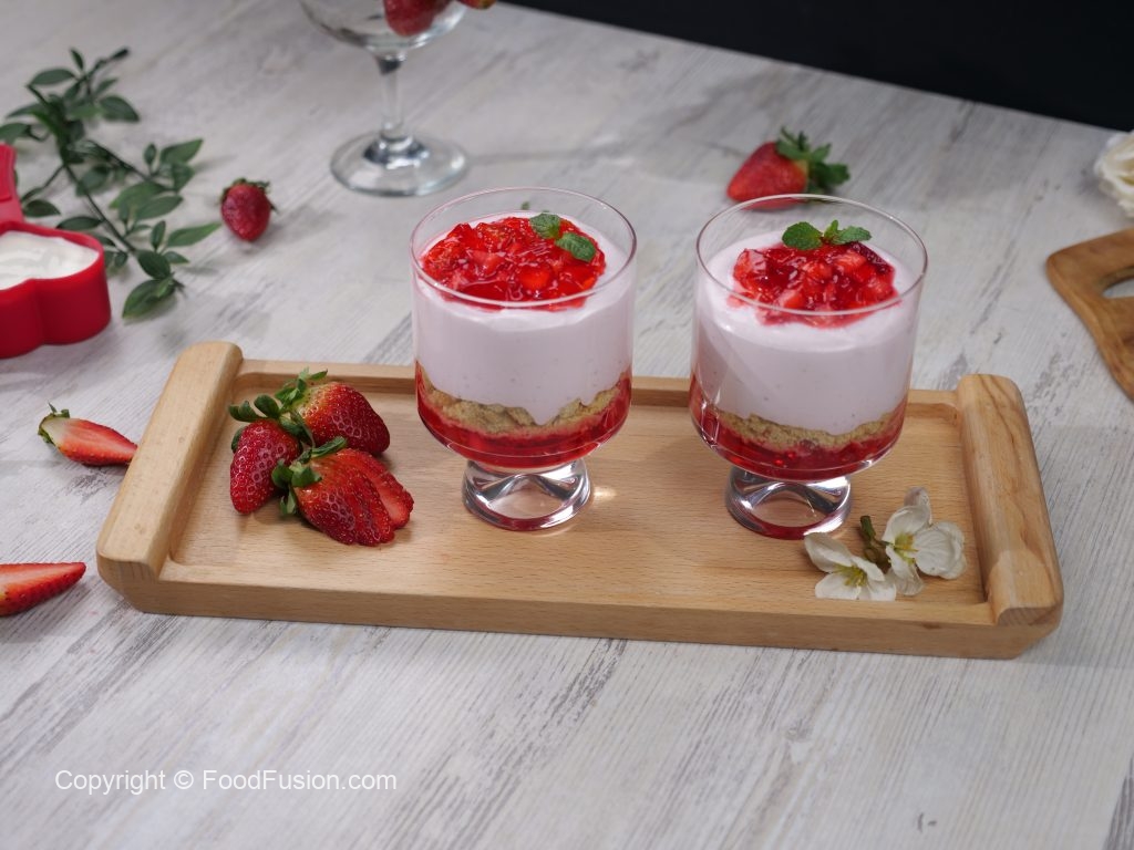 -In a serving glas,add & spread strawberry & jelly mixture,biscuit crumbs,prepared strawberry cream mixture & top with strawberry & jelly mixture.