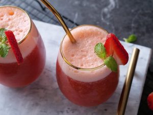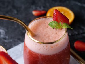 In a blender jug add fresh strawberries, honey, fresh orange juice, crushed ice & blend well.