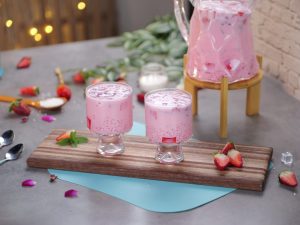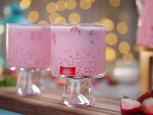 -In a jug,add red jelly cubes,coconut jelly cubes,cooked tapioca sago,srawberry chunks,ice cubes, prepared milk & stir well.