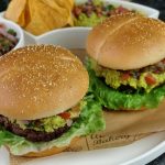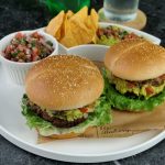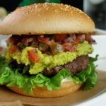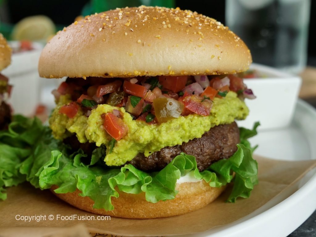 On burger bun,add & spread sour cream,lettuce leaves,beef patty,guacamole,salsa and top with burger bun.