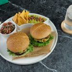 On burger bun per sour cream dal ker pheela lein,salad patta,guacamole aur salsa dal ker upper sa top bun rakh dein.
