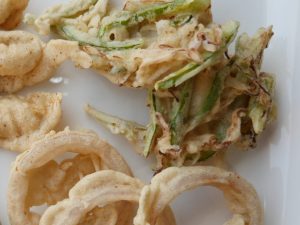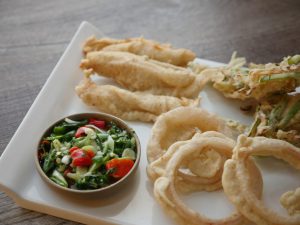 In wok,heat oil and fry batter coated vegetables until golden & crispy.
