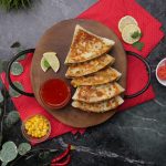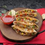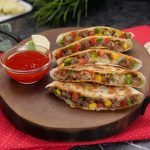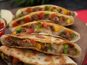 -Grease frying pan with cooking oil & cook stuffed tortillas from both sides until golden brown & apply oil in between (makes 12 triangles quesadillas).