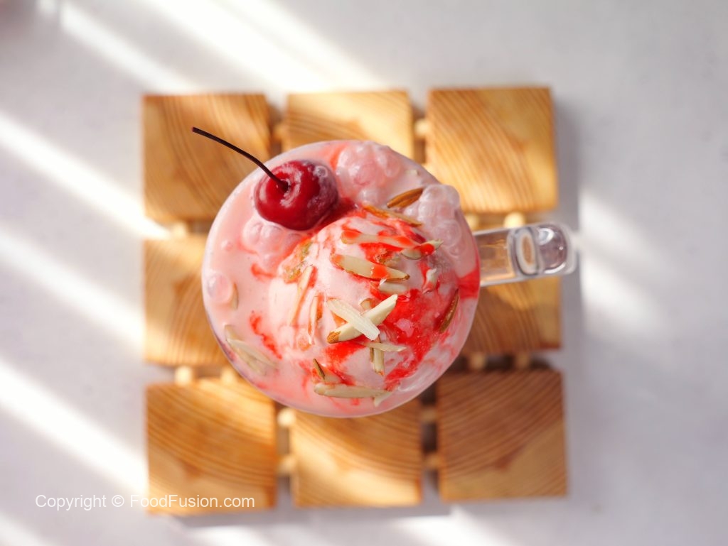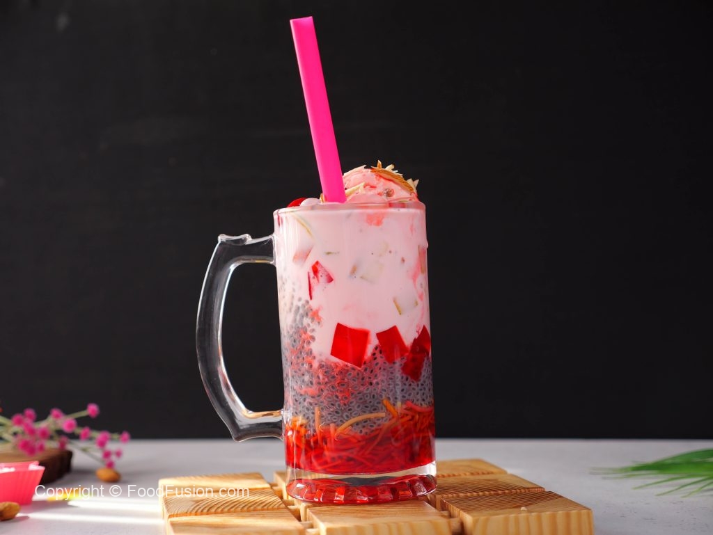 -In a serving glass add rose syrup, colourful vermicelli, soaked basil seeds, tutti frutti frozen dessert, prepared red jelly, apple, sapodilla, almonds, prepared rabri milk mixture, tutti frutti frozen dessert, garnish with rose syrup, almond, cherry & serve!