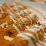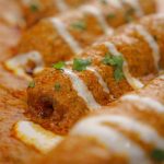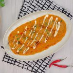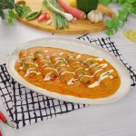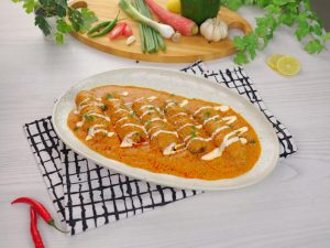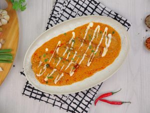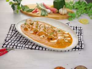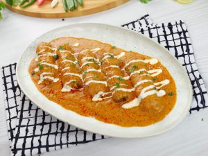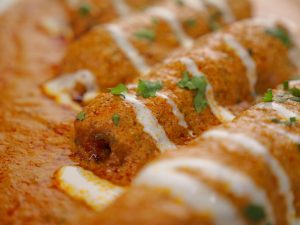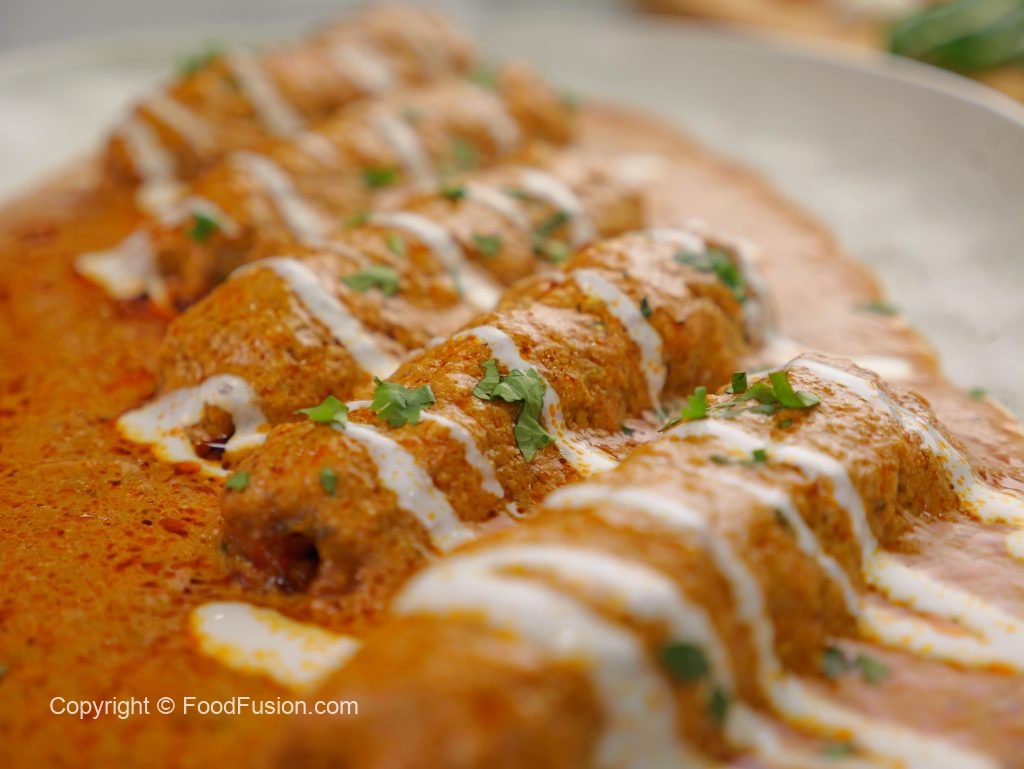 -In a serving platter add vegetable seekh kabab, pour gravy over kabab, garnish with cream & fresh coriander, serve with naan!